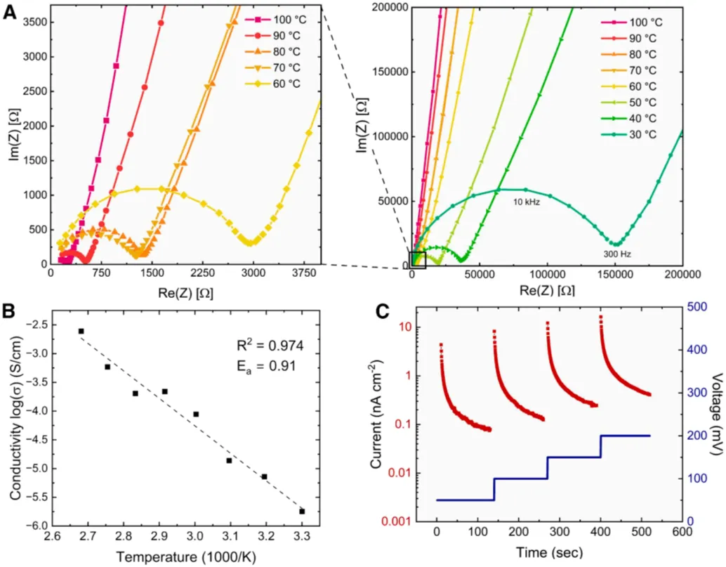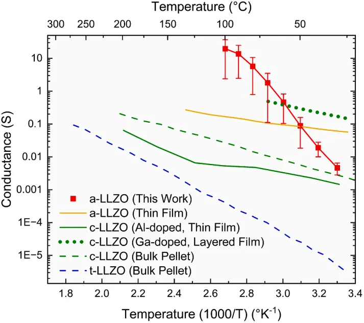 等离子体固化a-LLZO薄膜的离子和电子导电性通过Pt/a-LLZO/Pt对称电池进行评估。电化学阻抗谱(EIS)数据显示,薄膜在30℃时离子导电性为2×10-6 S/cm,到100℃时增加到1×10-2 S/cm,显示出与文献中其他非晶态薄膜相当或更高的导电性。虽然其导电性比立方LLZO低1-2个数量级,但在100℃时,等离子体固化的a-LLZO的离子导电性接近薄膜立方LLZO和块体立方LLZO的水平。这一结果表明,等离子体固化工艺能够有效提高a-LLZO薄膜的离子导电性,且未掺杂的a-LLZO薄膜表现出接近薄膜立方相的导电性。此外,掺杂可能进一步提高离子导电性,为未来的改进提供了机会。