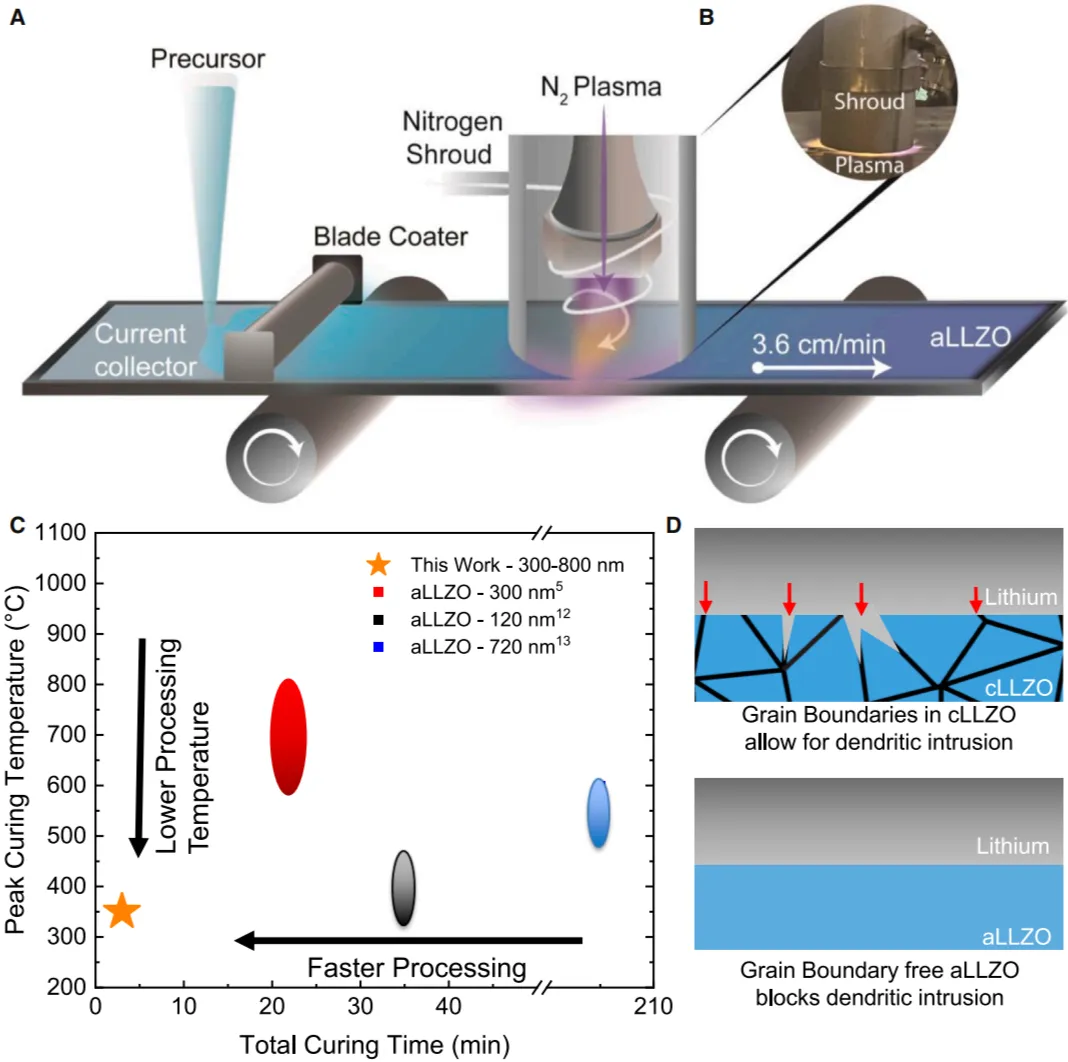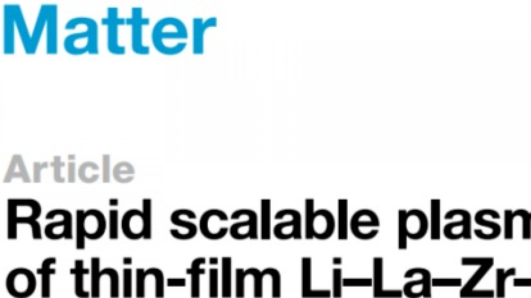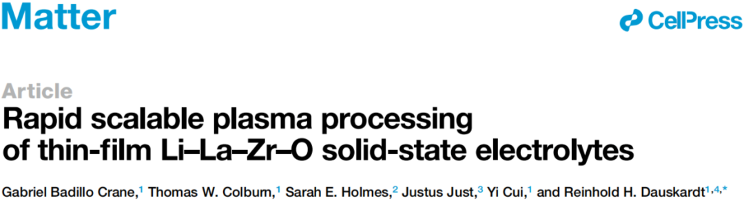 相关研究成果以“Rapid scalable plasma processing of thin-film Li-La-Zr-O solid-state electrolytes”为题发表在Matter上。