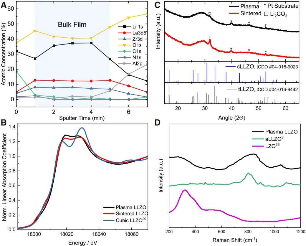 等离子体固化工艺生产的a-LLZO薄膜经历加速固化和致密化过程,同时保持非晶态特性。通过XPS分析,薄膜显示出与过量锂(43%)的LLZO一致的化学计量比,且碳和氮含量极低,表明前驱体几乎完全转化。XANES数据表明,等离子体固化和烧结的a-LLZO在氧化态和原子结构上与商业立方LLZO有显著差异。XRD表征显示薄膜高度非晶态,无立方LLZO、四方LLZO或焦绿石型LZO杂质相。拉曼光谱分析显示,薄膜中存在过氧化锂和扭曲的Zr-La键合环境,这与非平衡快速固化过程有关。这些结果表明,等离子体固化工艺能够高效生产高质量的a-LLZO薄膜,具有优异的化学和结构特性。