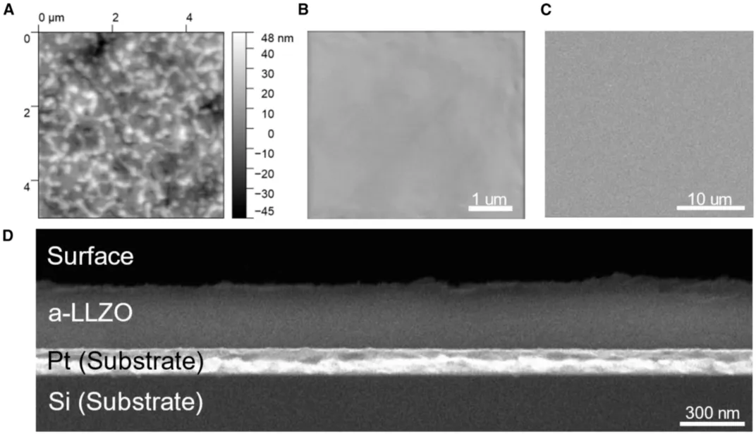 表面形态的原子力显微镜(AFM)分析显示,薄膜具有低缺陷率,其均方根(RMS)粗糙度为6.1纳米,这一数据是通过对多个薄膜的5×5微米分析区域进行测量得到,并且几乎没有AFM扫描伪影(图2A)。这一粗糙度优于其他固态薄膜(例如超平滑的锂铝锗磷酸盐(LAGP))通过纳米抛光所达到的粗糙度,并且等同于高度机械抛光的LLZO颗粒的均方根粗糙度。在固态电解质中,较低的粗糙度通常表明锂沉积均匀且稳定,并且界面电阻较小。薄膜的粗糙度是直接从合成过程中获得的,避免了可能会引入次表面损伤并降低循环性能的后处理步骤。从顶部和横截面的扫描电子显微镜(SEM)分析均揭示了一种约500纳米厚的保形薄膜,该薄膜具有高密度,并且没有可见的可能导致锂金属电池短路的针孔。