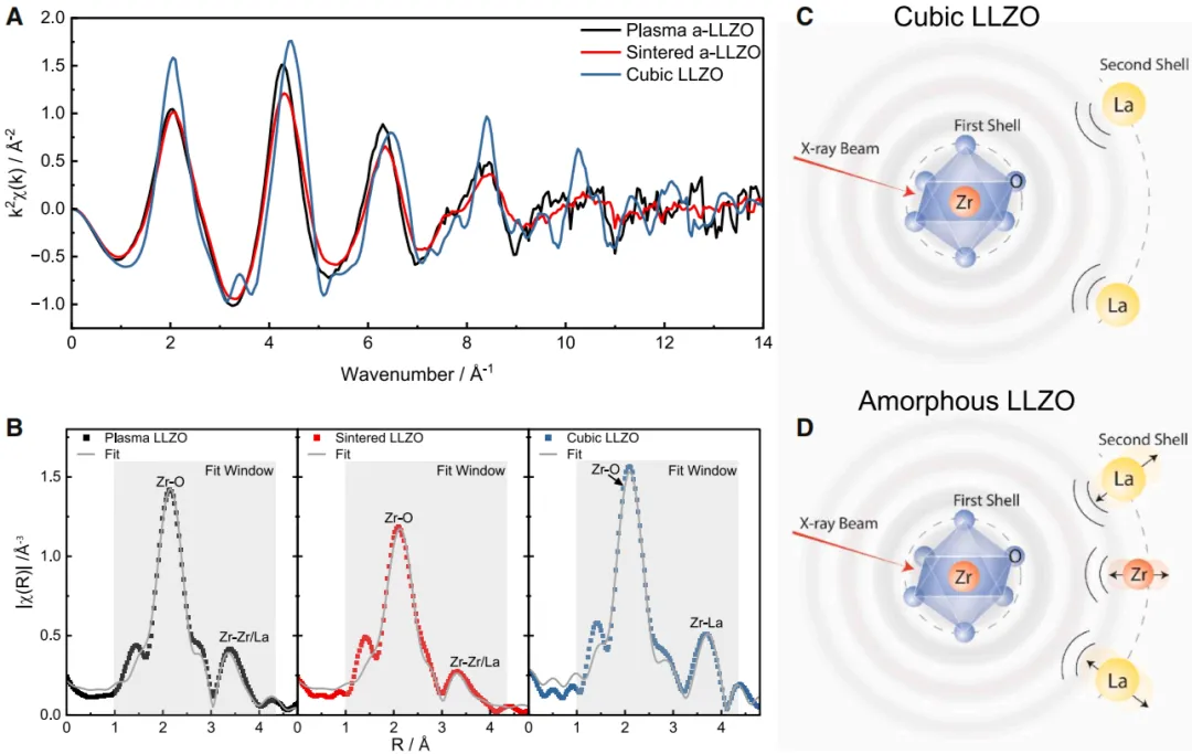 对等离子体固化和炉烧结的a-LLZO以及商业立方LLZO进行了扩展X射线吸收精细结构(EXAFS)分析。结果表明,a-LLZO在非晶态结构中具有空间扭曲的ZrO6八面体,Zr-O键长比立方LLZO更长,表明结构扭曲增加,这与锂离子跃迁距离和迁移熵的增加相关,从而提高了预指数导电因子。第二壳层分析显示,a-LLZO中Zr-Zr相互作用富集度高于Zr-La,且Zr-Zr键长在两种a-LLZO样品中均显著存在,而立方LLZO中仅存在Zr-La键。等离子体a-LLZO显示出更有序的Zr-Zr相互作用,而炉烧结a-LLZO则表现出更高的Zr和La的均方相对位移,表明结构扭曲更严重。这表明等离子体加工通过快速非平衡路径抑制了次级相的形成,而炉烧结则促进了这些相的生成。结合XRD结果,等离子体生产的LLZO在分子和薄膜长度尺度上均展现出非晶态、玻璃态键合特性。
