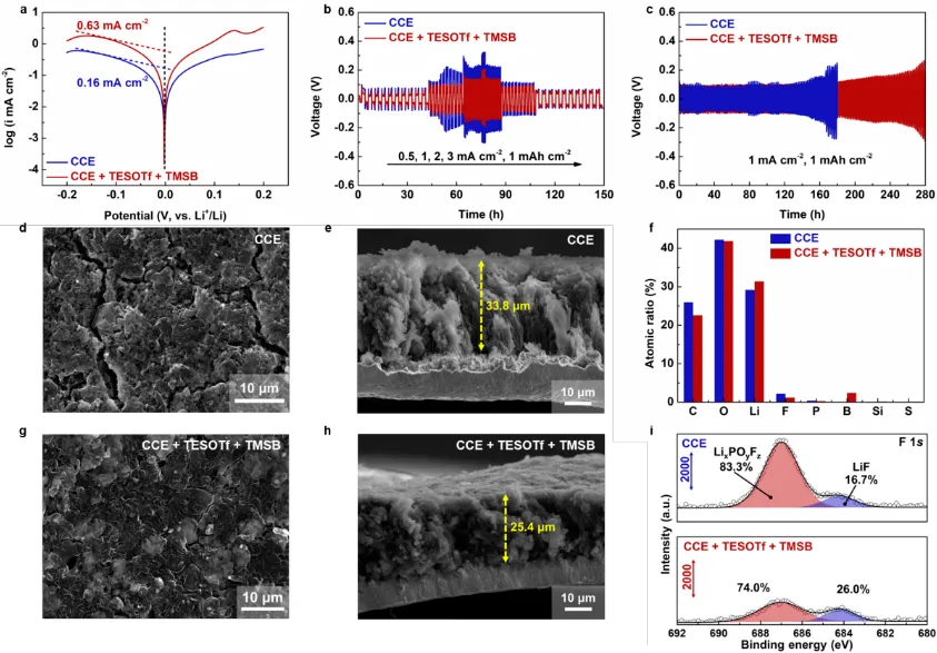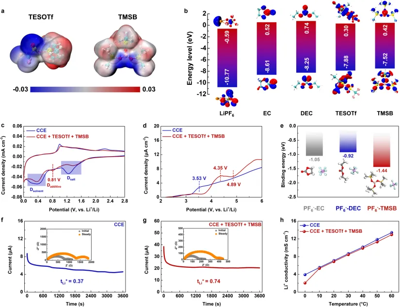 理论计算结果表明TESOTf中的三氟甲烷磺酸(OTf)基团更容易在负极处还原生成LiF。TMSB则通过吸电子效应增强了B-O键周围电子密度,B原子作为电子受体与阴离子有效相互作用。HOMO和LUMO能级计算显示,TESOTf和TMSB的HOMO能级较高,优先在正极处被氧化形成稳定的CEI。CV和LSV测试进一步表明,CCE + TESOTf + TMSB的还原分解峰移至0.81 V,而CCE的溶剂分解峰被抑制至4.89 V,显示出更高的稳定性。