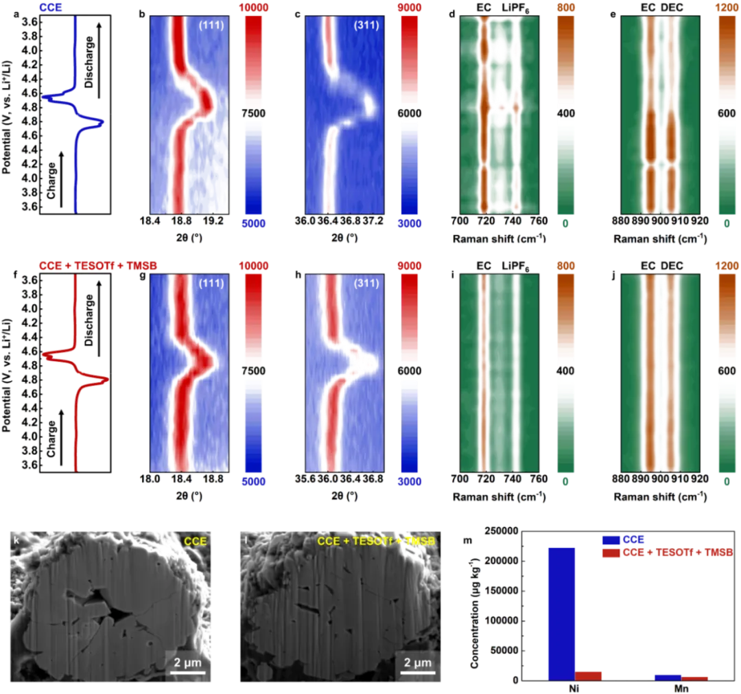 原位测试结果表明,TESOTf和TMSB的加入有效改善了Li-LNMO电池的循环稳定性。XRD分析显示,CCE体系中LNMO(111)和(311)面信号发生明显位移和强度变化,而在CCE + TESOTf + TMSB体系中变化较小,表明添加剂减少了副反应。原位拉曼光谱分析显示,改性电解质稳定了电解液,尤其在4.9 V高压下,电解液的分解显著减缓。FIB-SEM图像显示,在CCE中循环后的LNMO电极出现明显孔隙和裂纹,而添加剂的引入能够有效保护电极结构。