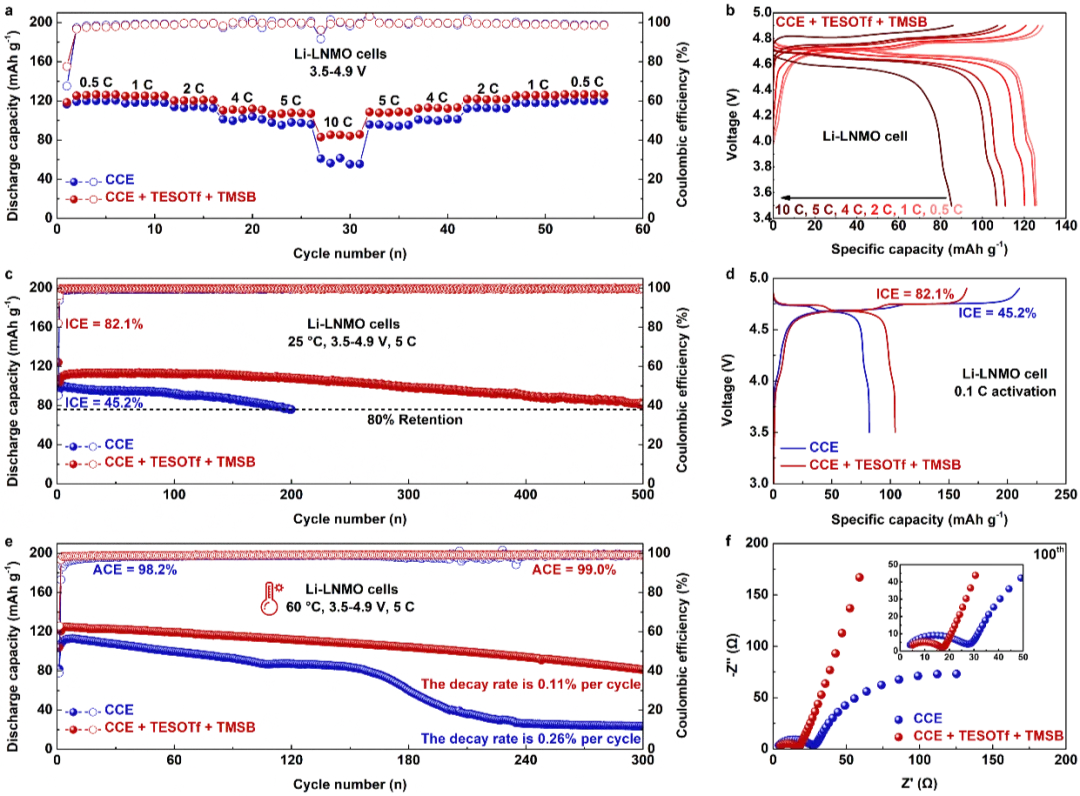 在4.9 V超高截止电压下,改性电解质的Li-LNMO电池在不同倍率下表现出更高的放电容量和更低的容量衰减。长循环测试中,基于CCE + TESOTf + TMSB的Li-LNMO电池在500次循环后保持80%的容量,而对照组循环200圈后容量就降低至80%。即使高温下(60°C),硅基添加剂的引入也能显著提高了Li-LNMO电池的稳定性,并且显示出更低的界面阻抗较低,证实了硅基添加剂对Li-LNMO电池副反应的有效抑制。
