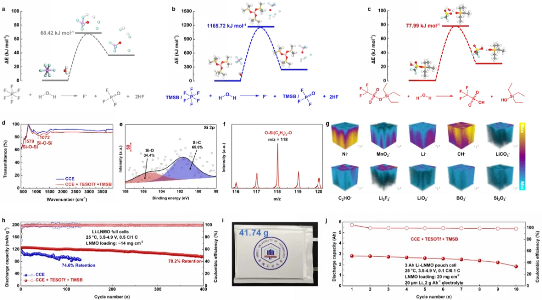 DFT计算表明,TESOTf和TMSB显著提高了PF6−水解的能垒,减少了电解质中的副反应。因此,TESOTf和TMSB的引入能够协同作用,从而改变PF6−的分解途径,并在LNMO表面自聚合形成硅氧烷聚合物,提升LNMO的高压稳定性。FTIR、拉曼和XPS分析确认了更稳定的CEI的生成,TOF-SIMS进一步验证了硅氧烷聚合物的存在。最终,基于改性电解质的Li-LNMO全电池在0.5C/1C下循环超过400次,保持78.2%的容量,且成功组装了具有高能量密度(超过300 Wh kg−1)的3 Ah Li-LNMO软包电池。