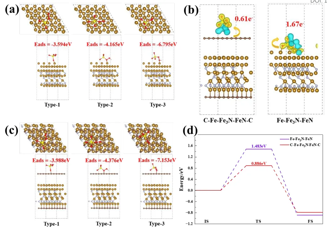 图5. PMS 在催化剂表面的吸附与活化机制:PMS 在 (a) Fe/Fe₃N/FeN 和 (c) 石墨碳包覆 Fe/Fe₃N/FeN 上的吸附构型与吸附能;(b) 不同催化剂对 PMS 吸附模型的微分电荷密度图(黄色与绿域分别代表电子富集与耗尽,插值为巴德电荷);(d) PMS 活化过程的反应能垒(IS、TS 和 FS 分别代表初始结构、过渡态和最终结构)