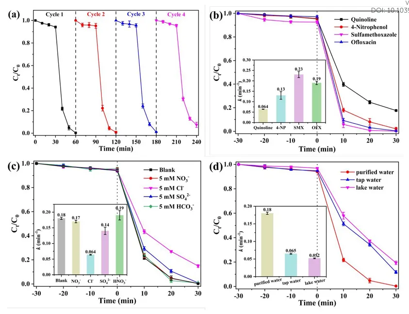 图7. Fe-NC-FJH 催化剂的稳定性与普适性研究:(a) 循环实验,(b) Fe-NC-FJH/PMS 体系对不同污染物的降解性能,(c) 不同阴离子对喹啉降解的影响,以及 (d) 在实际水体中对喹啉的降解效果。反应条件:T = 30 °C,[有机物] = 20 mg/L,[催化剂] = 100 mg/L,[PMS] = 2 mM。