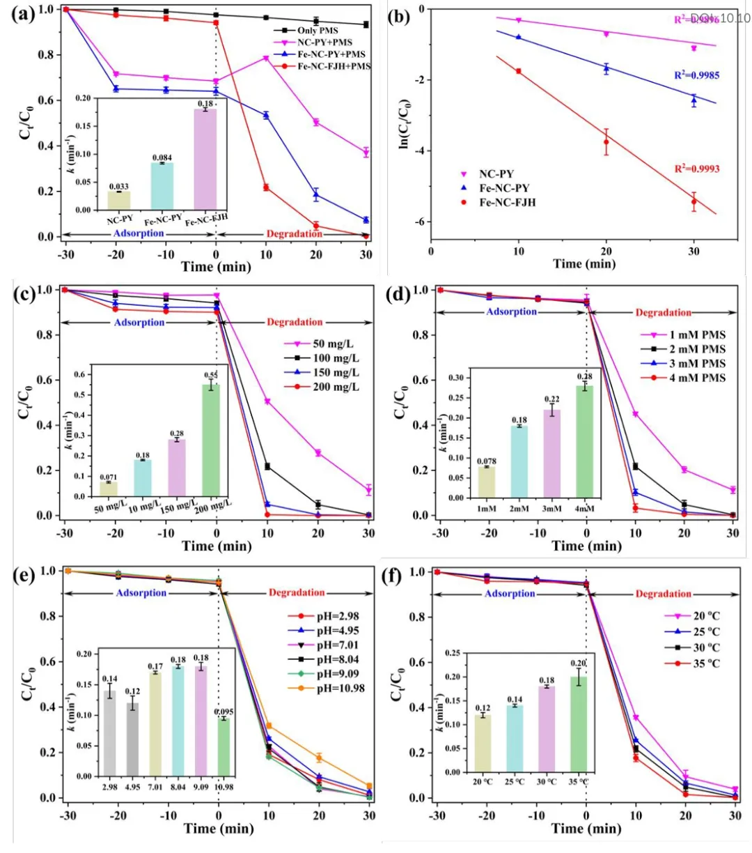 图3. 催化降解性能评估:(a) 不同催化剂对喹啉的去除效果,(b) 喹啉降解的准一级反应动力学,以及不同 (c) 催化剂投加量、(d) PMS 浓度、(e) pH 值和 (f) 温度对降解效果的影响