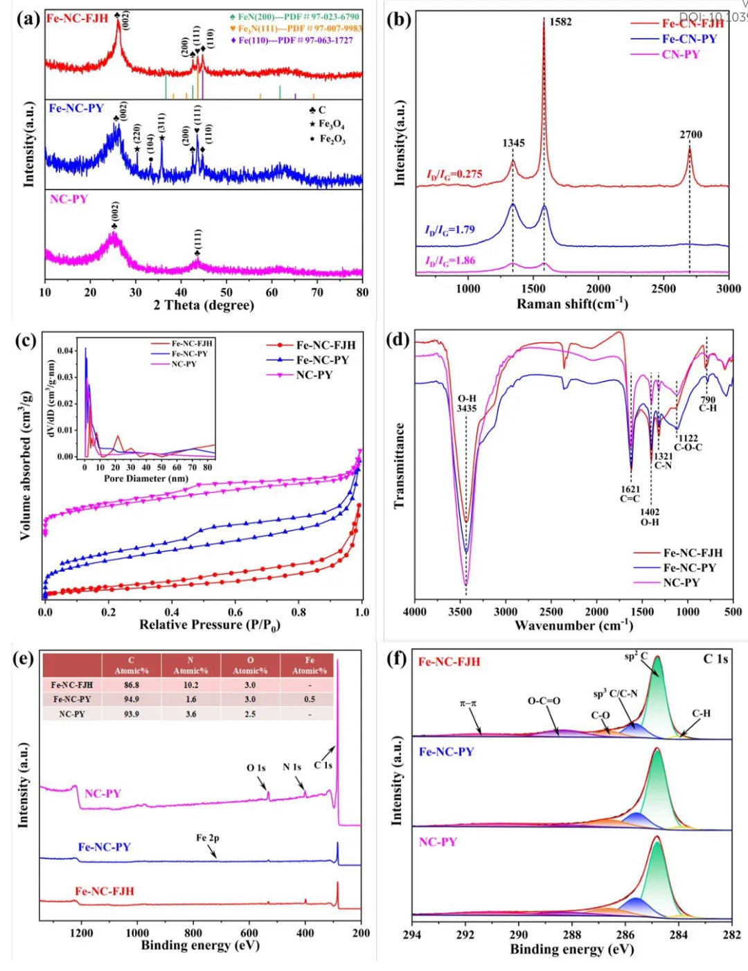 图2. 催化剂的物理化学性质:(a) XRD 图谱,(b) 拉曼光谱,(c) N₂ 吸附/脱附等温线及孔径分布图,(d) FT-IR 光谱,(e) XPS 全谱,和 (f) C 1s 高分辨率 XPS 光谱