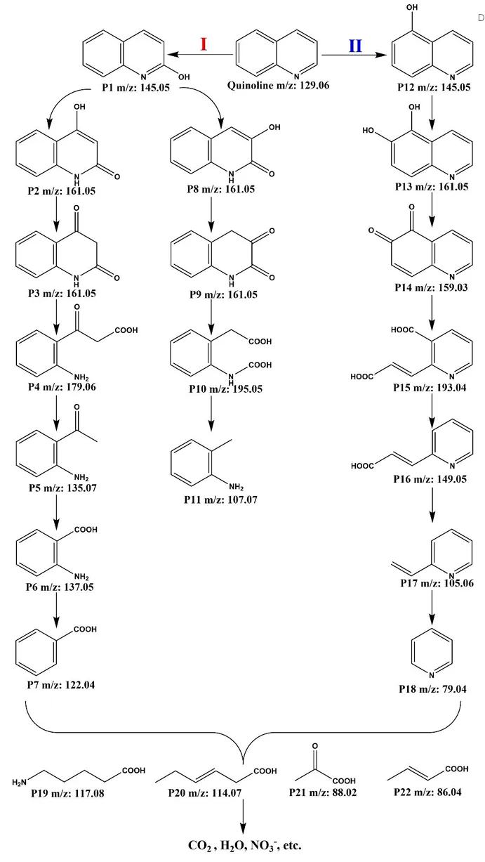 图6. Fe-NC-FJH/PMS 体系中喹啉的降解路径推测