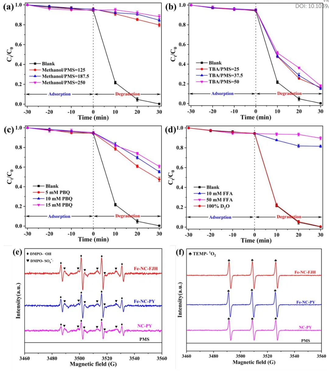 图4. 活性氧化物种鉴定:(a) 甲醇、(b) 叔丁醇、(c) 对苯醌 和 (d) 糠醇 对 Fe-NC-FJH/PMS 体系降解喹啉的影响;Fe-NC-FJH/PMS 体系的 (e) •OH/SO₄•⁻ 和 (f) •O₂⁻ 的 ESR 谱图