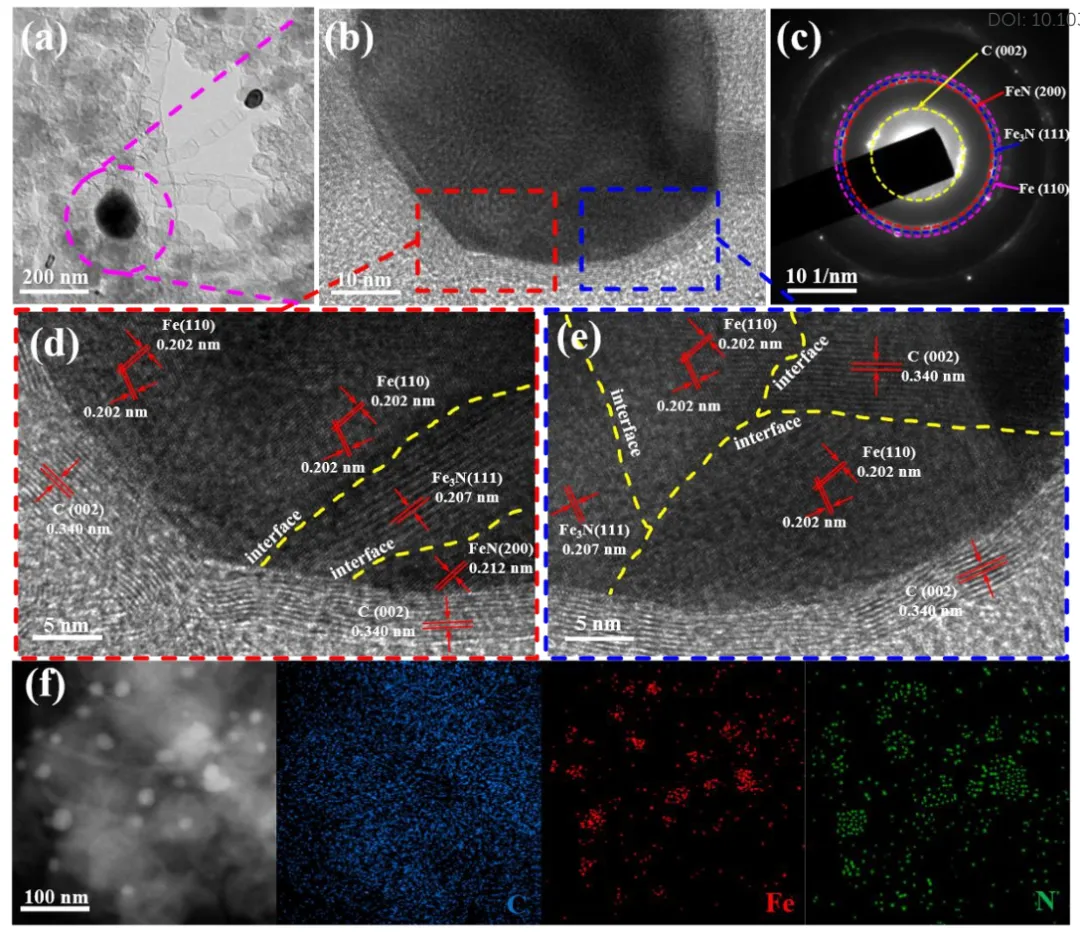 图1. Fe-NC-FJH 催化剂的形貌与结构表征:(a) TEM 图像,(b, d, e) HR-TEM 图像,(c) SAED 图谱,以及 (f) EDS 元素分布图