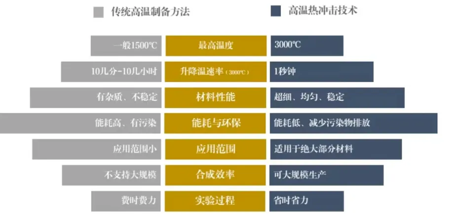 该技术基于焦耳定律,通过大电流产生的电阻热,在极短时间内实现材料的快速升温,甚至能在1秒内将材料加热至3000-4000℃的高温。这种极速的温度变化为材料制备和处理提供了前所未有的可能性。焦耳高温加热技术显著超越了传统加热方法,如马弗炉和管式炉,其加热速度之快,远非传统加热设备所能比拟。