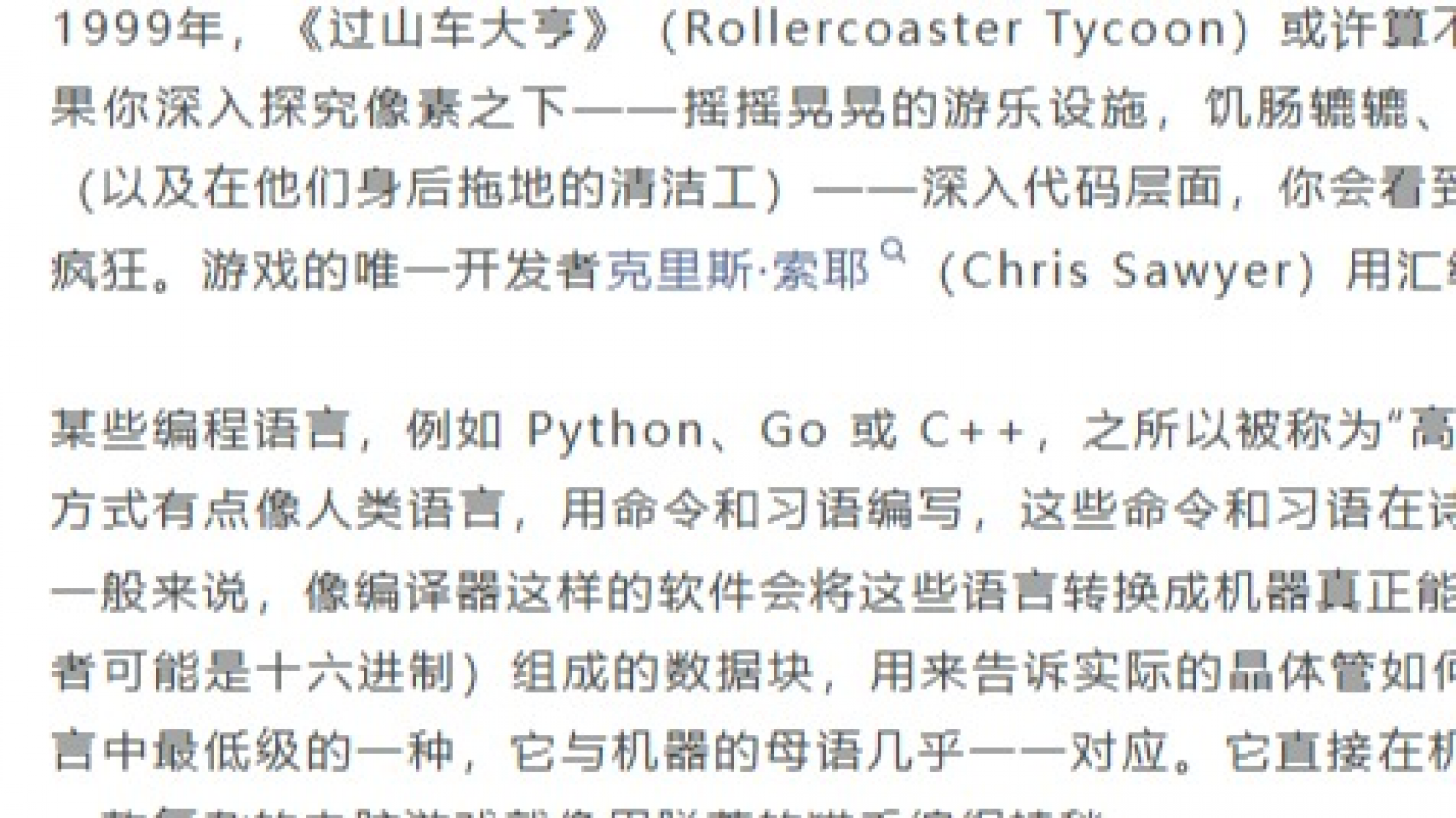 某些编程语言,例如 Python、Go 或 C++,之所以被称为“高级”语言,是因为它们的工作方式有点像人类语言,用命令和习语编写,这些命令和习语在诗歌朗诵会上或许会用得上。一般来说,像编译器这样的软件会将这些语言转换成机器真正能读懂的东西:由 1 和 0(或者可能是十六进制)组成的数据块,用来告诉实际的晶体管如何工作。汇编语言是“低级”语言中最低级的一种,它与机器的母语几乎一一对应。它直接在机器上编码。用汇编语言开发一款复杂的电脑游戏就像用脱落的猫毛编织挂毯。