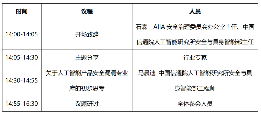 为解决漏洞情报碎片化、技术资源分散化,助力企业精准识别人工智能产品安全隐患、提升安全防护技术水平,中国信息通信研究院人工智能研究所依托中国人工智能产业发展联盟(AIIA)安全与治理委员会召开人工智能安全漏洞风险研讨会。本次会议将重点研讨人工智能漏洞风险与边界、人工智能漏洞影响产品类型与范围、人工智能漏洞收集平台运营建议与需求,并邀请行业专家分享人工智能安全漏洞防范经验做法等。会议具体安排如下: