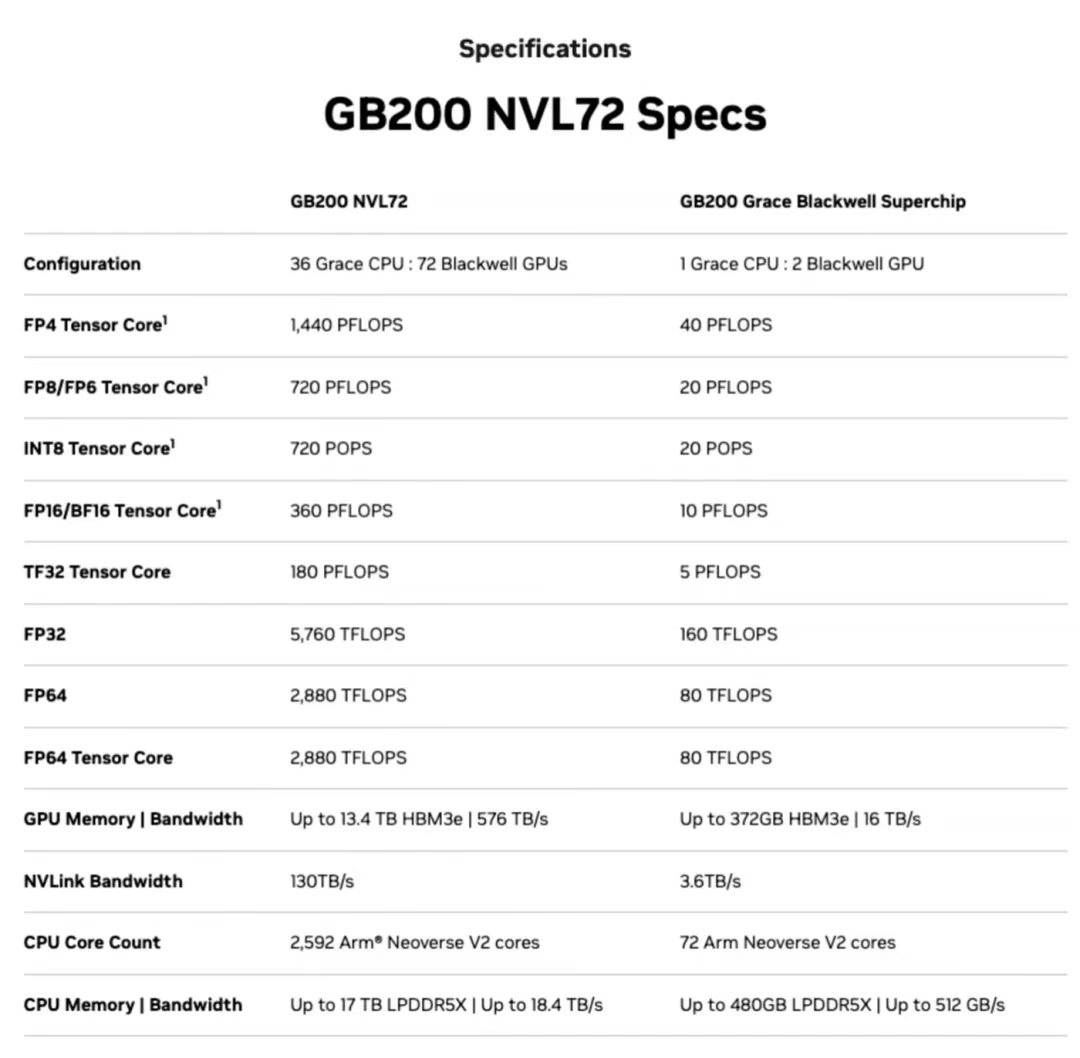 大统一内存:借助 NVLink 和 NVLink-C2C,机柜内所有 GPU 可访问彼此的 HBM 内存及 Grace CPU 的 DDR 内存,总计 13.5TB HBM 和 17TB LPDDR5X 系统内存。