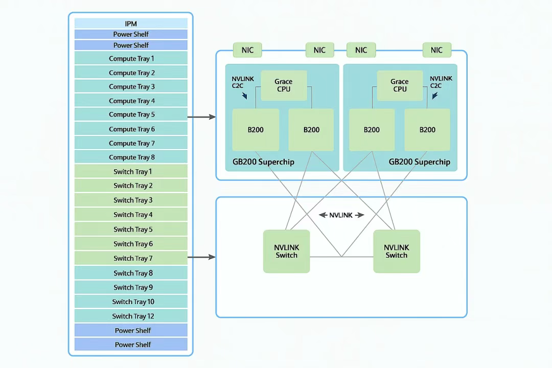 在超级节点机柜内,18 个计算托盘(Compute Tray)中的 72 个 B200 GPU 通过 NVLink 5 和铜缆实现全互连,并连接到 9 个交换机托盘(Switch Tray)中的 18 个 NVSwitch 芯片。