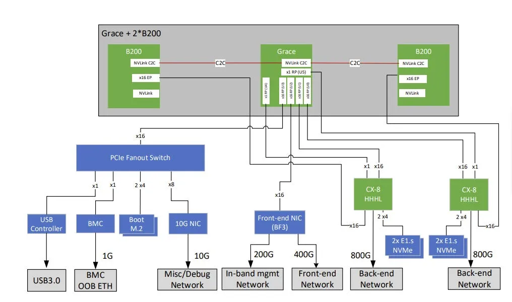 Scale-Out支持将 8 个 DGX GB200 NVL72 单元集成为一个超级 POD(SuperPOD),包含 576 个 B200 GPU。每个计算托盘中的 4 个 GPU 各配备一个 CX8 800Gbps RNIC(RDMA 网卡),连接至基于 InfiniBand RDMA 的Scale-Out网络。