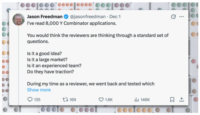 最近,我们看到Y Combinator (YC) 校友、现任Orange Collective合伙人Jason Freedman发了一条有意思的推文。
