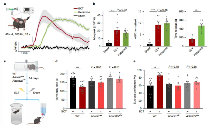 更令人激动的是,他们在针对 ECT 疗法的小鼠实验中也观察到同样清晰的腺苷信号。也就是说,吃药和 ECT 这两种常规的抑郁症疗法,原来共走一条“神经高速路”。