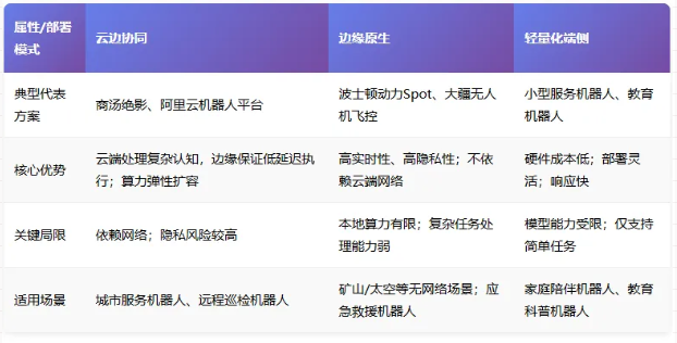 「云边协同全栈方案」高层认知决策(如任务规划、多模态理解)在云端完成,低层运动控制在边缘端(机器人本地)执行。 优势:利用云端大算力处理复杂任务,边缘端保证低延迟执行。 「边缘原生全栈方案」所有感知、决策、控制逻辑都在机器人本地硬件上运行,不依赖云端。 优势:高实时性、高隐私性,适合偏远或无网络场景(如矿山、太空)。 「轻量化端侧全栈方案」针对低算力硬件(如小型服务机器人、无人机)优化,通过模型压缩、量化等技术实现端侧独立运行。 典型代表:大疆无人机的飞控与视觉导航全栈。