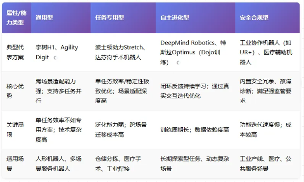 「通用型全栈方案」追求跨场景适配能力,支持多种任务(如导航、抓取、交互),目标是“一个系统解决多类问题”。 典型代表:商汤绝影、宇树H1的通用人形机器人全栈。 「任务专用型全栈方案」针对特定场景深度优化,如工业抓取、仓储分拣、医疗辅助,强调单任务的极致效率和稳定性。 典型代表:波士顿动力Stretch(仓储分拣专用)、手术机器人的运动控制全栈。 「自主进化型全栈方案」核心是“持续学习+闭环反馈”,通过真实环境中的交互数据不断优化模型和动作策略。 典型代表:DeepMind Robotics的强化学习驱动方案、特斯拉Dojo训练的Optimus系统。 「安全合规型全栈方案」针对工业、医疗等强监管场景,内置安全冗余、故障诊断、合规审计等机制。