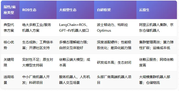 「ROS生态全栈方案」:基于机器人操作系统(ROS/ROS 2)构建,是工业界最成熟的技术底座。 「大模型生态全栈方案」:以LLM、多模态大模型为核心,结合机器人控制模块(如LangChain+ROS)。 「自研框架全栈方案」:头部厂商为满足差异化需求,完全自研底层框架(如波士顿动力、特斯拉)。 「云原生全栈方案」:用容器、K8s等云原生技术管理机器人集群,适合大规模部署的场景。
