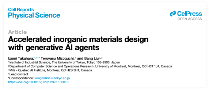 该研究以:Accelerated inorganic materials design with generative AI agents(利用生成式 AI 智能体加速无机材料设计)为题,于 2025 年 12 月 17 日,在线发表于 Cell 子刊 Cell Reports Physical Science 上。
