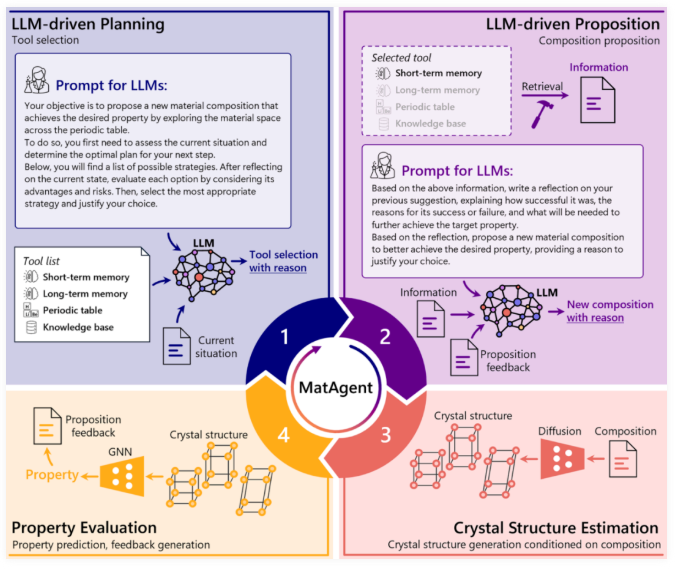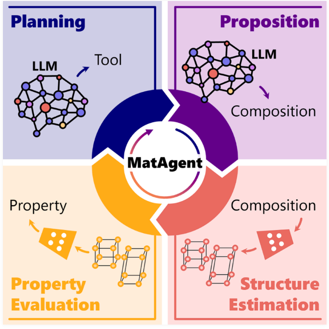 MatAgent 将大语言模型(LLM)推理与生成式扩散和属性预测模型相结合;