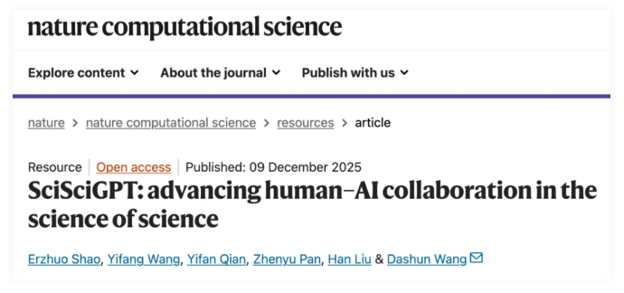 近日,美国西北大学王大顺教授团队在 Nature 子刊 Nature Computational Science 上发表了题为:SciSciGPT: advancing human–AI collaboration in the science of science 的研究论文。