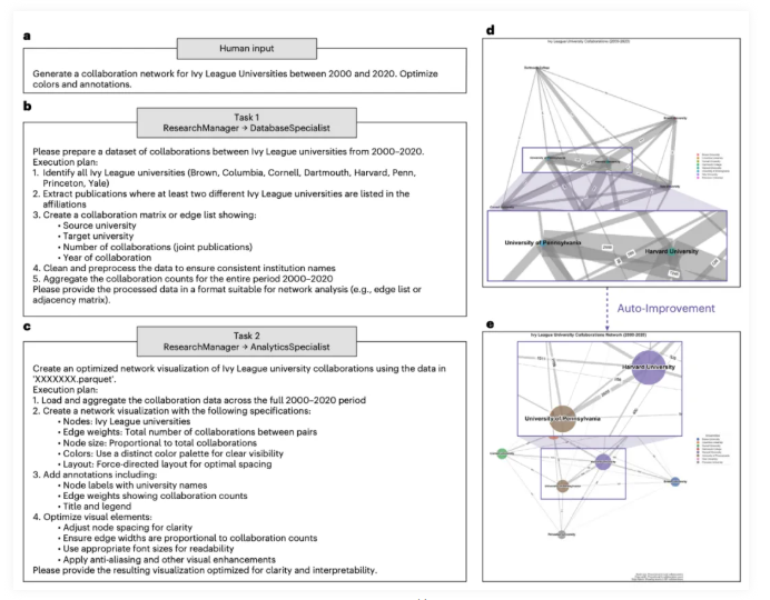 ResearchManager 首先将问题分解为数据提取和可视化两大任务。DatabaseSpecialist 迅速行动,识别八所常春藤盟校,从包含 1100 万篇论文的数据集中筛选出至少两所盟校合作的论文,生成合作数量矩阵。