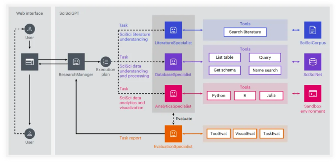 该研究推出了一个专门为“科学学”(SciSci)研究设计的 AI 智能体系统——SciSciGPT,它不同于普通的 AI 聊天机器人,它是一个多智能体协作框架,它能够快速读完数百万篇文献,精通各种统计方法,可以编写代码处理海量数据,还能不断自我检查优化结果,能够像人类研究员一样分解复杂任务、调动专业工具、检查优化结果,并保证研究过程的透明可复现。