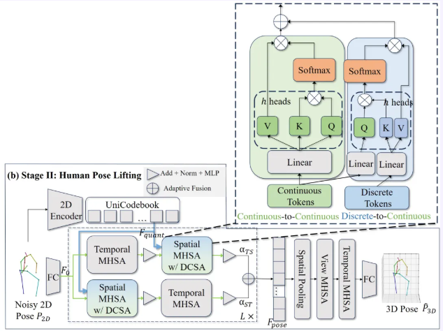2. Discrete-Continuous Spatial Attention (DCSA):离散-连续空间注意力机制。模型不再只进行传统的关节点互相关(Joint-to-Joint Attention),而是额外引入关节到离散原型的注意力(Joint-to-Discrete Token Attention)。实现上,二者分别使用自注意力和交叉注意力实现。