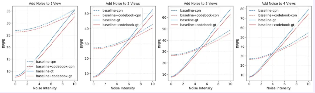 我们在测试时不重新训练,对随机 1–4 个视角 的 2D 关键点加入不同强度的高斯噪声。结果显示:引入 UniCodebook 的模型在所有噪声强度下都更稳,并且噪声越大优势越明显;说明离散原型能提供结构化“锚点”,有效抑制噪声在多视角交互中的传播与累积。