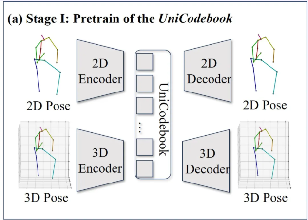 Stage I:先训练一个统一的 2D-3D 离散先验 UniCodebook,让模型掌握人体结构的稳定模式。