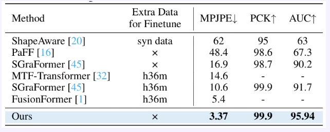 在更贴近真实场景的 MPI-INF-3DHP 上,我们在 不使用额外微调数据 的前提下取得领先: