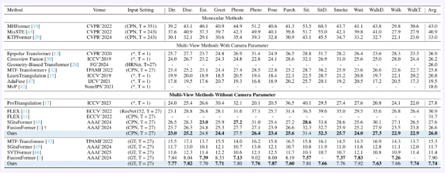 在 Human3.6M 基准上,我们在 CPN 检测 2D 输入 和 GT 2D 输入 两种设置下都取得了 SOTA:分别达到 26.0mm / 7.74mm MPJPE,证明 UniCodebook + DCSA 在保持高精度回归的同时,也能提升跨视角融合质量与稳定性。