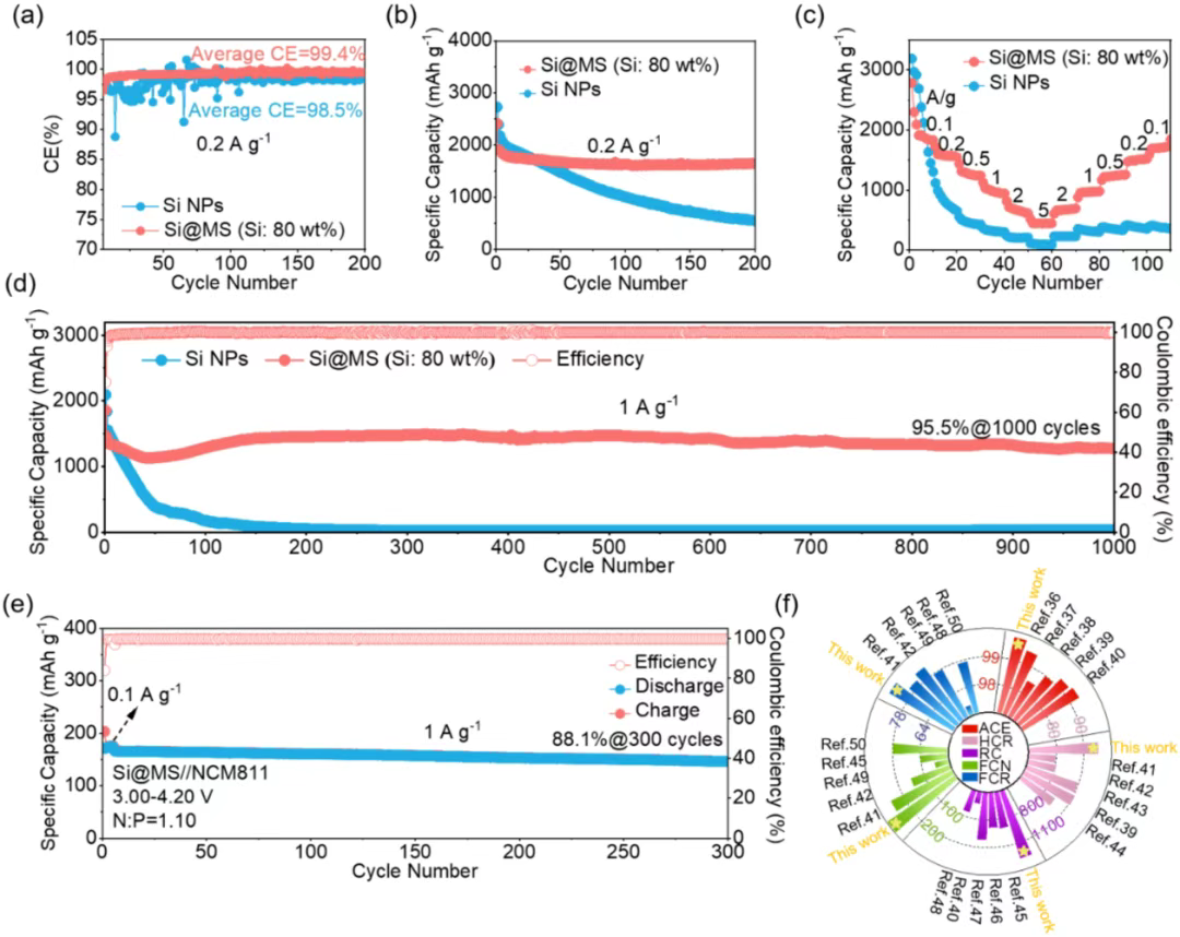 超致密F-SEI的构筑使Si@MS电极在0.2 A g-1的极低电流密度下实现了99.4%的高平均库伦效率,在1 A g-1下循环了1000周容量保持率为95.5%。与NCM811匹配组装全电池,也展现出了300周的长循环稳定性。