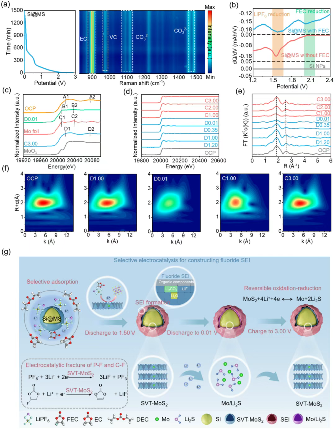 综上所述,本工作提出了一种选择性电催化的策略,通过富含硫空位的1T相MoS2层在硅表面构建了有机/无机层级分布的超致密的F-SEI。通过DFT计算、原位拉曼光谱、软x射线吸收光谱、TOF-SIMS、TEM和AFM等表征手段对F-SEI的形成机理、组成、空间结构和力学性能进行了深入分析。此外,通过XANES、EXAFs和小波变换以及电化学阻抗谱等表征手段相结合表明,SVT-MS涂层不仅能够促进Li+的传输,还可以作为电催化剂选择性地电催化电解液中的富氟分子。得益于精心设计的F-SEI, Si@MS电极在极低的电流密度(0.2 A g-1)下表现出99.4%的平均库仑效率。在1 A g-1下循环1000次后,容量保持率达95.5%,平均库仑效率达99.8%以上。通过选择性电催化策略构建F-SEI的界面工程策略,将为开发下一代可充电电池的先进负极提供了一条非常独特的途径。