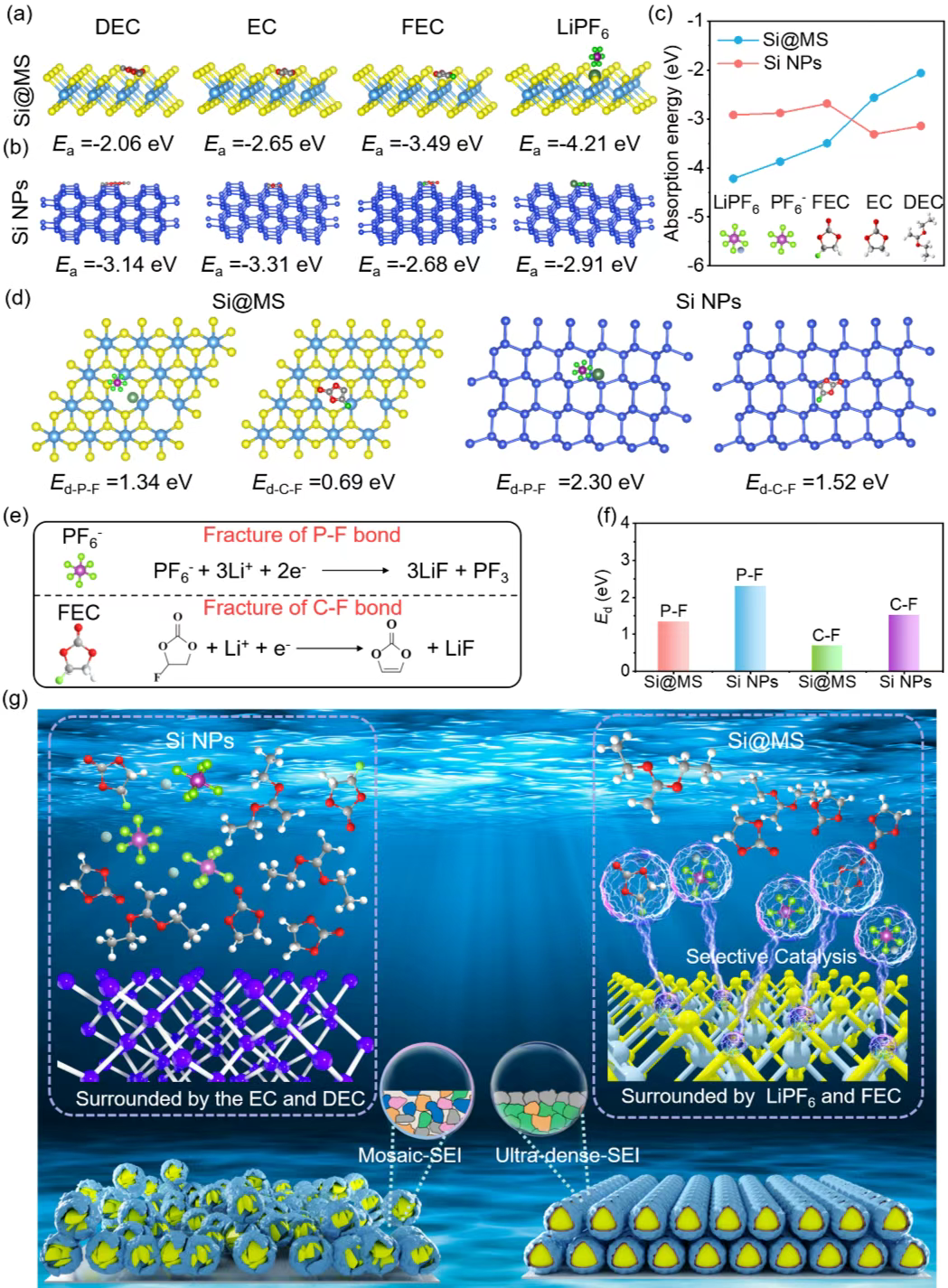 为了实现长循环寿命的硅负极,本文在硅表面构筑了一层富含硫空位的1T相MoS2。通过DFT计算表明,硫空位对电解液中的富氟分子具有更强的吸附能,因此硅表面的内层优先被富氟分子包裹,而外层为有机电解液。并且进一步通过DFT计算发现,硫空位显著降低了P-F键和C-F键的断裂能,从而促进在首周锂化的过程中,内层的富氟分子快速转换为高模量和高致密性的无机LiF,外层转换为对应的有机组分,从而构建了一层有机/无机分级结构的超致密F-SEI。
