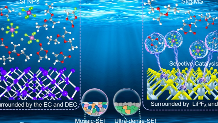 由于自然形成的固体电解质界面(SEI)膜的机械稳定性较差以及在电化学循环中的持续增厚,硅负极具有较差的循环寿命,这严重阻碍了硅负极的商业化应用。目前通用的策略为使用富氟的电解液添加剂,从而提高SEI膜中的无机LiF的含量从而提高其机械稳定性。然而这些电解液添加剂在分解的同时会伴随产生松散多孔的有机组分,与无机组分交织在一起后形成了疏松且力学性能较差的马赛克结构的SEI,这不利于硅负极的长循环稳定性。因此,对SEI的组分含量,空间分布以及结构的调控对于实现硅负极的长循环稳定性至关重要。