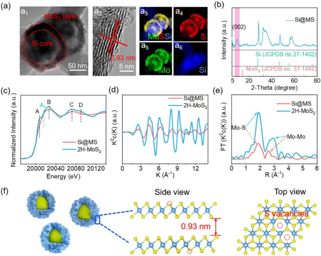近日,北京理工大学吴锋院士团队的苏岳锋,李宁等人提出了一种选择性电催化的策略,通过在硅表面构筑了一层富含硫空位的1T相MoS2。MoS2中丰富的硫空位选择性吸附并催化了电解液中的富氟分子,从而在硅表面诱导形成了内层为致密的LiF,外层为有机组分的层级结构的超致密氟化SEI(F-SEI)。所制备的Si@MS电极在极低的电流密度(0.2 A g-1)下能够实现99.4%的平均库伦效率,与NCM811匹配组装的全电池在循环300周后容量保持率高达88.1%。该文章发表在国际顶级期刊Materials Today上。Wengang Yan和Siyuan Ma为本文第一作者。