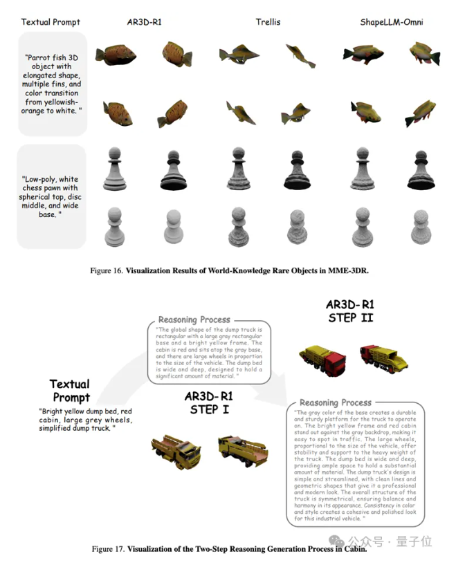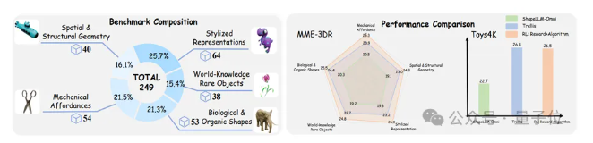 为此,研究团队提出了MME-3DR基准:包含249个精心筛选的复杂3D对象,评测维度覆盖多视角几何一致性、语义细节对齐、纹理真实感三个层次,专门用于衡量模型在推理密集场景下的生成表现。MME-3DR的设计使得仅靠记忆训练数据的模型无法取得高分,真正区分了生成能力与泛化推理能力的差距。