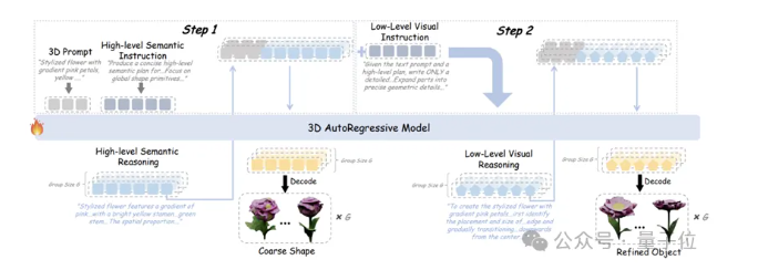 Step 1(粗粒度阶段):通过Chain-of-Thought生成高层语义推理,产出粗糙几何形状,专属奖励聚焦几何一致性与整体结构完整性;