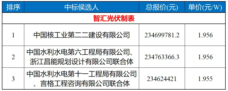 根据中标候选人公示,中国核工业第二二建设有限公司以1.956元/W位列第一候选人,如下表所示。