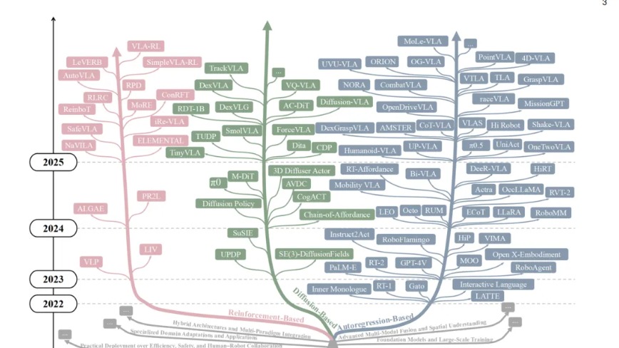 2023 年 RT-2 正式提出 “VLA” 术语,技术路线开始分化为 “自回归生成”“3D 视觉融合” 两大方向: