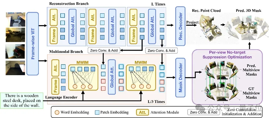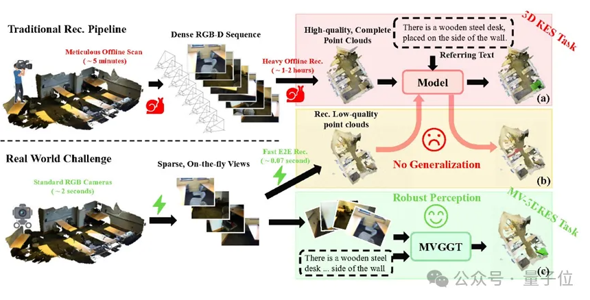 为了解决上述问题,研究团队定义了一个贴近实际应用的新任务——多视图3D指代分割(MV-3DRES),即要求模型模型在没有稠密点云作为输入的情况下,直接利用稀疏的多视角RGB视图和文本指令,联合重建场景并分割被指代对象。
