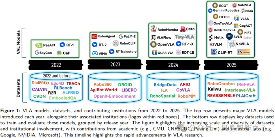 该领域发展迅速,大量架构、数据集和框架不断涌现。尽管研究成果增多,但文献中仍缺乏对架构基础、基准数据集、仿真平台及评估协议的全面系统综合,而这些共同塑造了当前 VLA 格局。明确当前技术水平,识别新兴模式、局限性和机遇至关重要。本研究将作为技术参考和概念路线图,加速具身基础模型和通用机器人智能的研究。