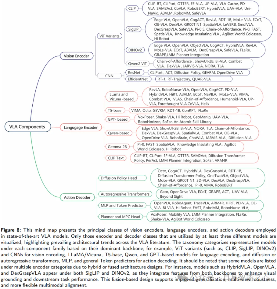 图 8 展示了 VLA 模型组件的综合分类法,围绕视觉编码器、语言编码器和动作解码器三个关联模块构建。视觉编码器中,基于 CLIP 和 SigLIP 的编码器因对比学习带来的强视觉文本对齐能力受青睐,应用于 CLIPort、RevLA、Edge VLA 等模型;DINOv2、Qwen2 VIT 等 ViT 变体因能建模长距离空间依赖和高级视觉语义,用于 Gato、Octo、HybridVLA、Chain-of-Affordance 等模型;ResNet、EfficientNet 等基于 CNN 的编码器则出现在 CLIPort、ACT、RT-1、QUAR-VLA 等模型中。