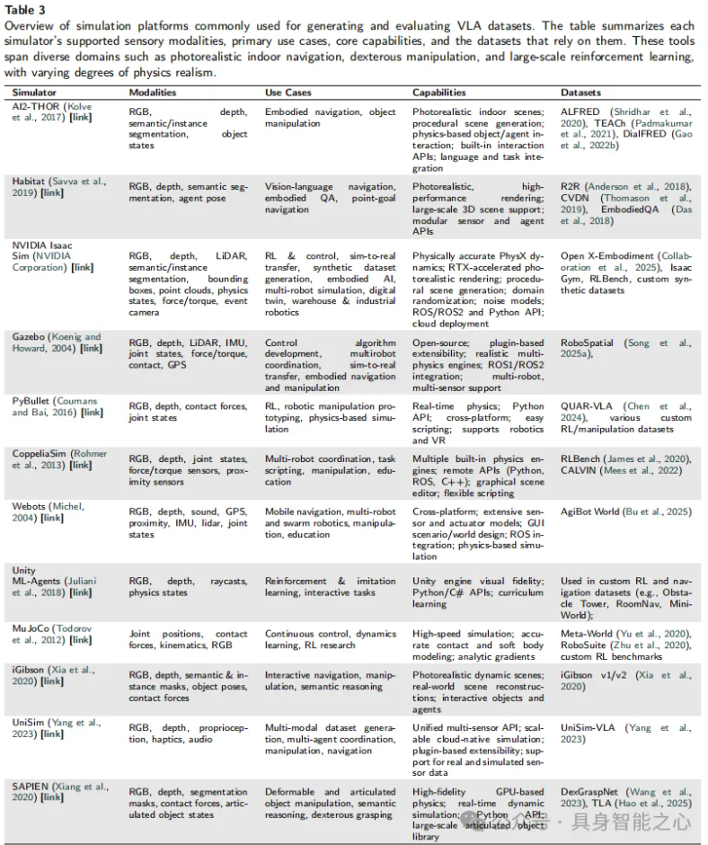 表 3概述了用于生成 VLA 数据集的当前最先进的仿真平台。该表总结了每个仿真器支持的感官模态、主要用例、核心能力以及依赖它们的数据集。这些工具涵盖了从逼真室内导航、灵巧操作到大规模强化学习等多个领域,物理真实性程度各不相同。